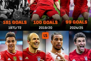 拜仁队史单赛季德甲进球数纪录是1971-72赛季,那个赛季德甲豪门打进了101球,2019-20赛季,他们打进100球险些追平该纪录。在联赛还是7轮的情况下,拜仁只需打进5球就可创造新的纪录。