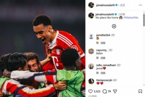拜仁中场穆西亚拉在社交媒体晒出与队友一起庆祝的照片,分享了晋级的喜悦,并配文写道:“没有比主场更好的地方了。”