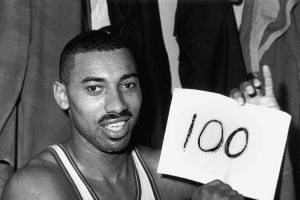 “最后一分钟,罗杰斯传给张伯伦,张伯伦射失;泰德·卢肯比尔抓到篮板球再给张伯伦,再射失;卢肯比尔继续抓到篮板,传球给卢克里克,卢克里克将球传到张伯伦手里。比赛还有46秒,张伯伦高高跳起,球进篮筐,100分。”
