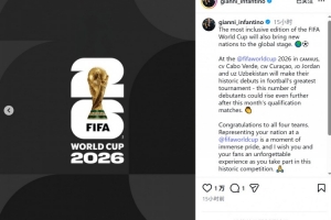 体育资讯3月12日讯 国际足联主席因凡蒂诺社媒发文,对即将首次亮相世界杯的国家队表示祝贺。